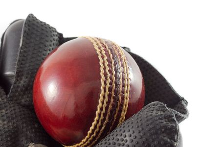 Wicket keeping glove with a new red cricket ball, isolated on white.