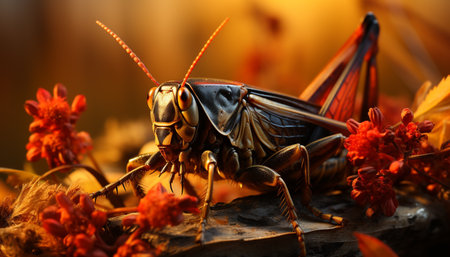 This stunning close-up image showcases a grasshopper in incredible detail, highlighting its vibrant colors and unique textures against a natural background.