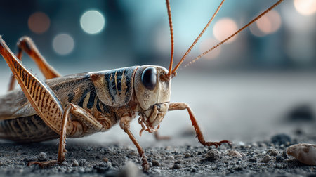 A striking close-up of a cricket showcasing intricate details such as its antennae, legs, and exoskeleton against an urban backdrop, highlighting wildlife resilience.