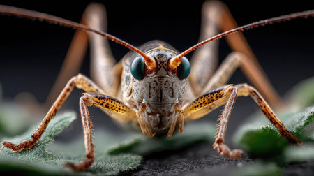 A fascinating close-up of a cricket perched on a branch, showcasing intricate details of its body and environment in stunning macro photography.
