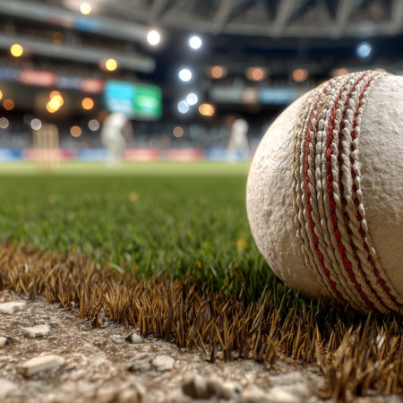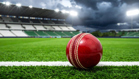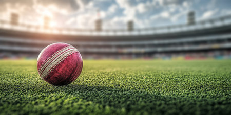 Cricket Ball Poised on the Field Against Stadium Horizon, Emblem of Tournament Energy at Arena, View