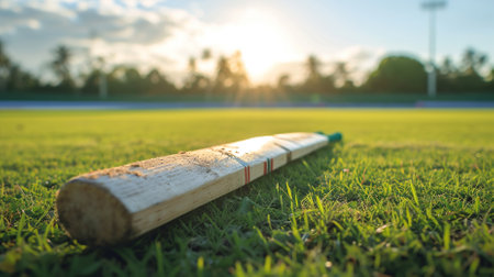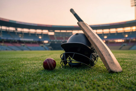 A wooden cricket bat, red leather ball and protective helmet rest on the green grass of a professional sports stadium pitch during a warm golden sunset evening before a match.