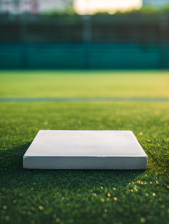 Ivory square platform for product presentation on a green pitch. Blurred Sports Background