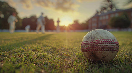 Close-Up of a Cricket Ball on the Field, Ready for Play Under Bright Sunlight on Grass Pitch