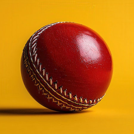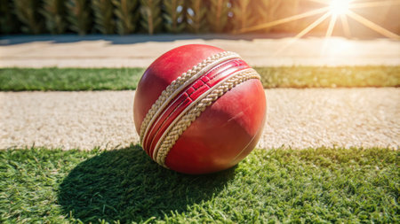Red cricket ball resting on crease line of pitch, minimalist editorial sports style with warm afternoon light.