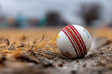 A cricket ball lies on dry soil, surrounded by scattered straw, as dusk settles over the field. The blurred backdrop features hints of greenery, indicating a serene outdoor atmosphere.