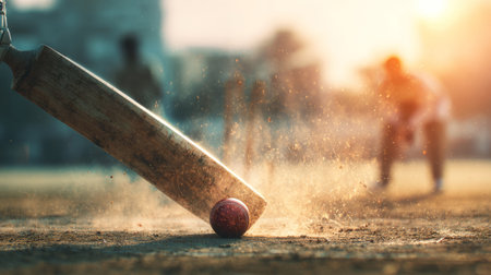 Cricket ball hitting the ground with sand flying in action sports moment.