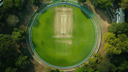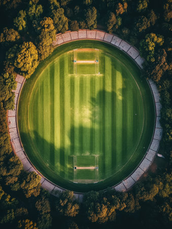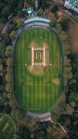 Aerial view of lush green cricket filed surrounded by trees, with green filed and tribunes for fans.