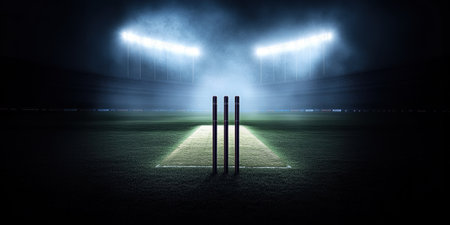 Illuminated cricket stumps stand dramatically in misty stadium, symbolizing game intensity and anticipation.