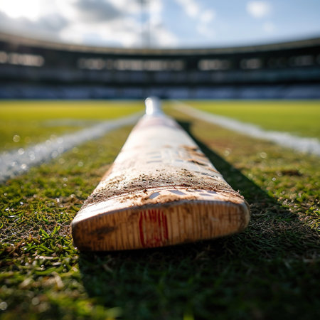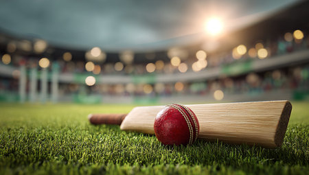 Cricket ball and bat on green grass with blurred stadium background