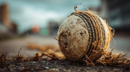 A close-up view of a weathered cricket ball lying on an urban surface, showcasing its texture and stitching against a moody dusk background.