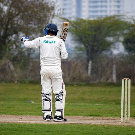 New Delhi India – March 3 2020 : Full length of cricketer playing on field during sunny day in local playground, Cricketer on the field in action, Players playing cricket match at field