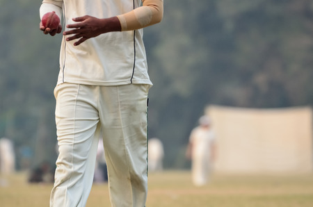 Right hand of cricketer holds old red leather cricket ball, soft and selective focus on hand, blurred cricket court background.