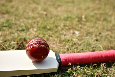 Cricket bat and red ball with natural lighting on green grass. Horizontal sport theme poster, greeting cards, headers, website and app