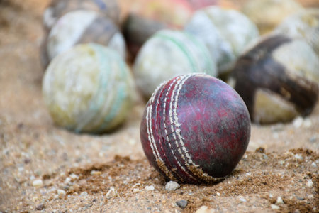 Old leather cricket balls for training and practising on sand floor beside the court, soft and selective focus on red cricket ball.