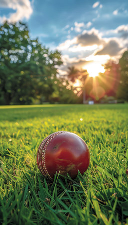Cricket Ball on Lawn, Red Leather Sphere on Green Grass, Outdoor Sports Action in Stadium Setting