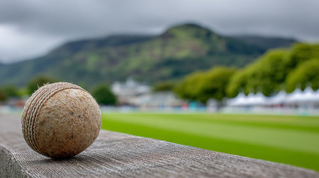 A close-up view of a cricket ball on a wooden surface with blurred green grounds and cloudy skies