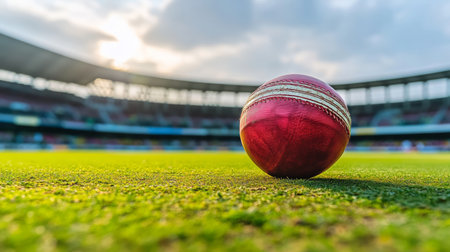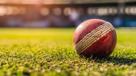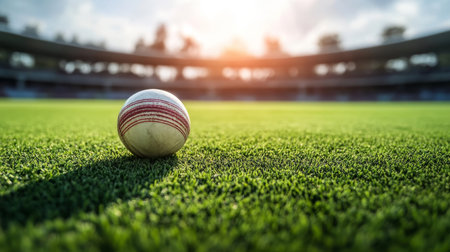 A cricket ball placed on a lush green grass field, ready for an exciting match in a stadium