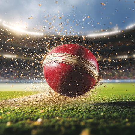 Dynamic Action as the Crimson Cricket Ball Glides Across the Emerald Pitch, Creating Dust Clouds