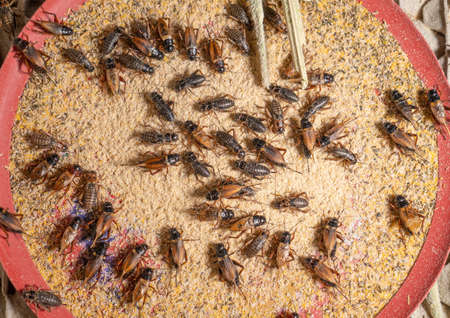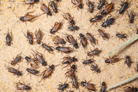 Farm crickets ,Close up of Crickets (Gryllidae) in farm,many crickets eating feed.