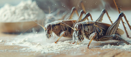 Dried crickets close up, on a wood countertop sprinkled with flour, organic food of future. Source of protein. Entomophagy concept. Banner, copy space