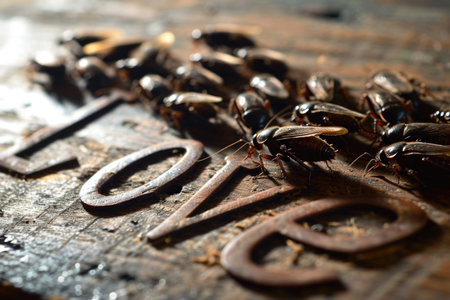 Crickets move slowly at dawn their silhouettes contrasting against the golden sunrise marking the start of a bright new year.