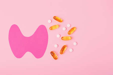Top view of paper thyroid gland with gelatin capsules and tablets.World thyroid day concept.