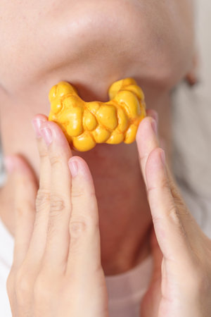 Woman holding human Thyroid anatomy model with her Neck. Hyperthyroidism, Hypothyroidism, Hashimoto Thyroiditis, Thyroid Tumor and Cancer, Postpartum, Papillary Carcinoma and Health concept
