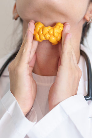 Doctor with human Thyroid anatomy model. Hyperthyroidism, Hypothyroidism, Hashimoto Thyroiditis, Thyroid Tumor and Cancer, Postpartum, Papillary Carcinoma and Health concept