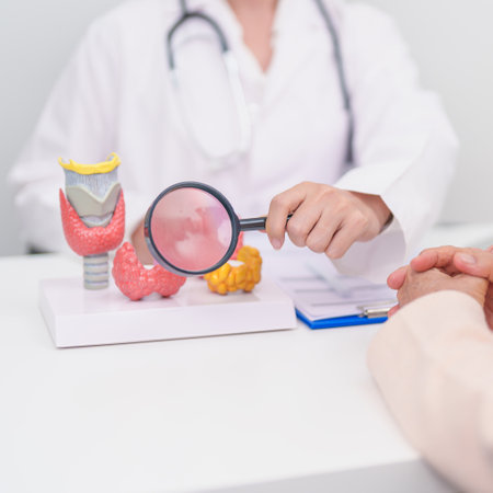 Elderly Patient consulting and Diagnosis with Doctor to Thyroid disease. Anatomy Thyroid model for Hyperthyroidism, Hypothyroidism, Hashimoto Thyroiditis, Thyroid Tumor and Cancer, Papillary Carcinoma