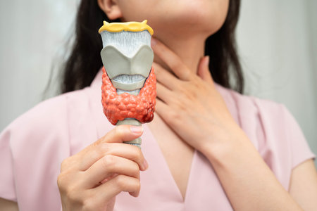 Hyperthyroidism, Overactive Thyroid, Thyroid Lymphoma, Asian woman with thyroid gland human anatomy model.