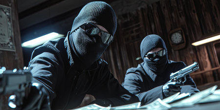Two burglar in balaclava stealing money from a bank vault