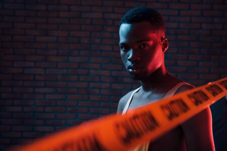 Yellow caution tape and uniform. Futuristic neon lighting. Young african american man in the studio.