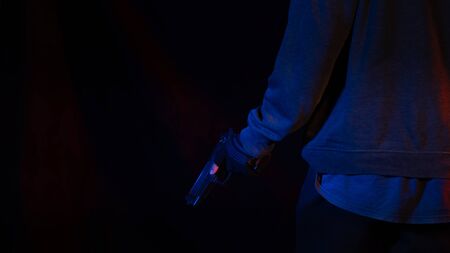 asian man holds a gun. Gun in his hand from the back isolated on black background.