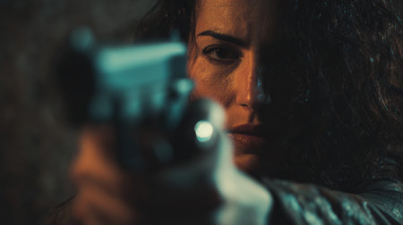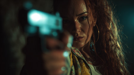 edgy cinematic portrait of young attractive and dangerous special agent woman or Asian mobster girl holding handgun pointing the gun fierce in Hollywood movie style