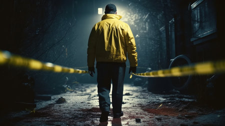 Closeup of a Crime Scene in a Deceased Persons Home. Dead man, Police Line, Clues and Evidence. Serial Killer and Detective Investigation concept.
