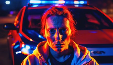 Police raid at night and you are under arrest concept. Silhouette of handcuffs with police car on backside. Image with the flashing red and blue police lights at foggy background. Selective focus