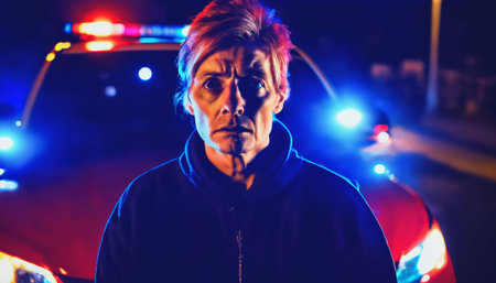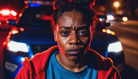 Forensic expert is conducting an examination in the dark apartment of a murdered woman. The dead body of a woman with evidence scattered on the floor, illuminated by the red light of a police siren.