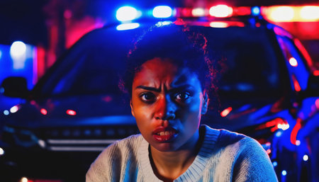 Close up yellow barricade tape with crime scene do not cross words over police background of blurred red and blue police lights bokeh