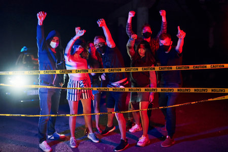 Hands raised high. Group of protesting young people that standing together. Activist for human rights or against government