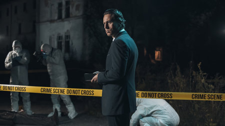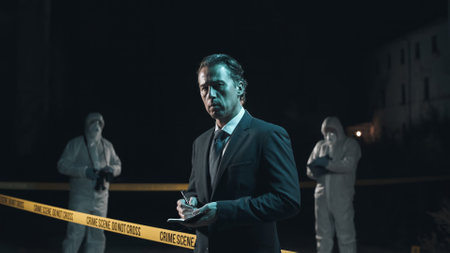 Detective inspecting area and taking notes in notebook at crime scene at night as forensic experts collect evidence behind police tape next to headless body