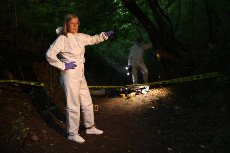 Photographing evidence, crime scene photography, investigator, policeman and professional criminological expert white coverall inspecting, examining behind barricade tape, yellow police line, safety