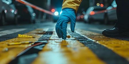 Police tape is securing a crime scene with law enforcement personnel investigating, showcasing blurred city lights and forensic evidence on the ground during a nighttime incident