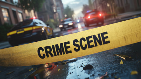 A nighttime urban emergency scene featuring caution tape stretching across a deserted road, with police lights glimmering in the blurred background.