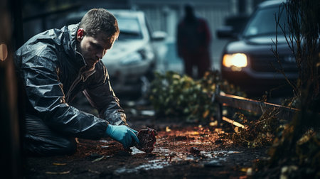 An expert is gathering evidence at a crime scene. The law and the concept of police forensics