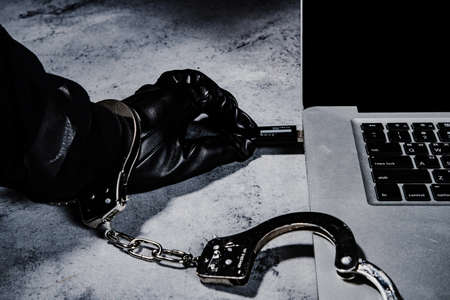 Cyber criminal arrest, unrecognizable hooded person with handcuffs, digitally enhanced with glitch effect, selective focus