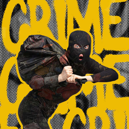 Contemporary art collage. Young woman in image of a thief wearing black balaclava and carrying big bag isolated over gray background with yellow lettering
