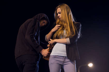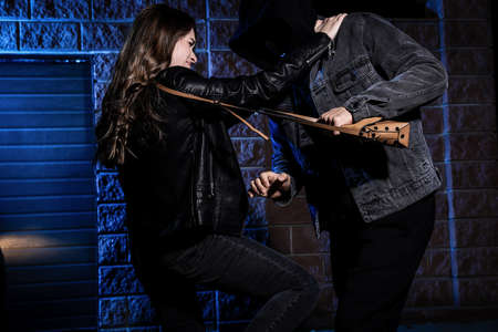 Criminal with knife attacking young woman outdoors at night. Self defense concept