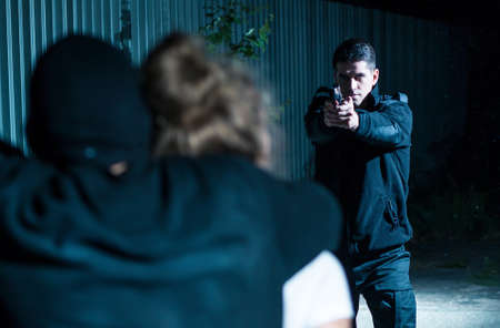 Young armed policeman pointing a gun at a masked thief who is holding his hands on his head