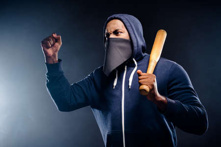 African american hooligan with baseball bat looking at camera near graffiti on wall